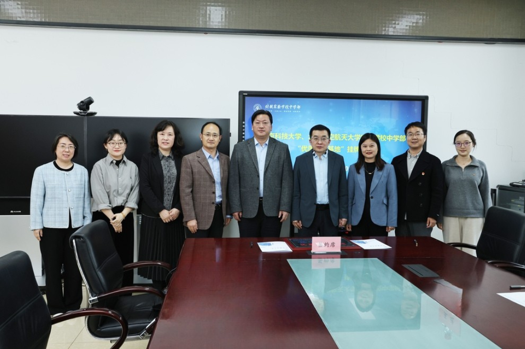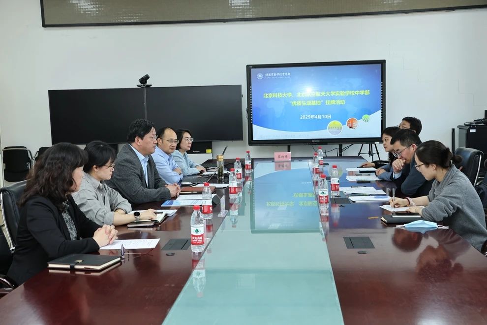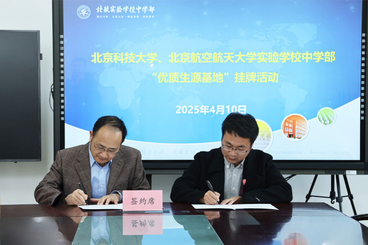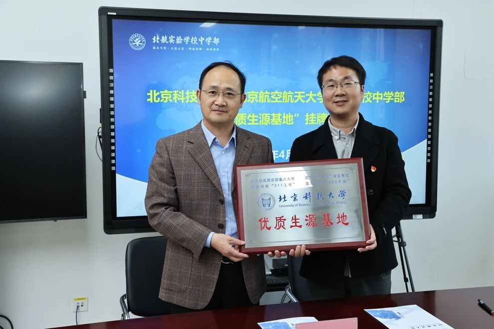 为加强中学与高校的教育衔接,共同培养拔尖创新人才,北京科技大学与北航实验学校中学部于4月10日正式签署“优秀生源基地”合作协议,并举行授牌仪式。此次合作旨在通过资源共享、课程共建、人才共育等方式,为我校优秀学子搭建成长平台,为高校输送更多品学兼优、具备发展潜力的毕业生。北京科技大学招生就业处处长、创新创业学院院长吕朝伟一行4人,北航实验学校党委书记马树微、校长宋友等领导出席了此次签约活动。